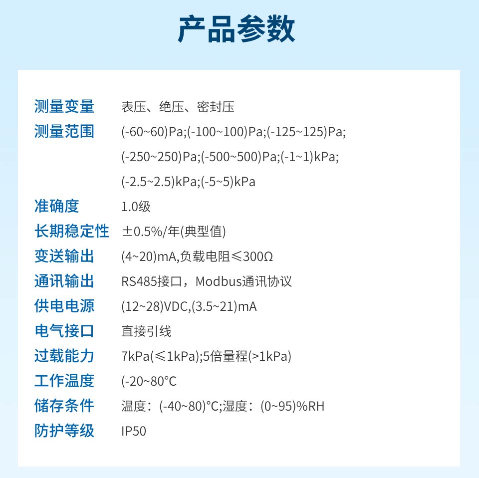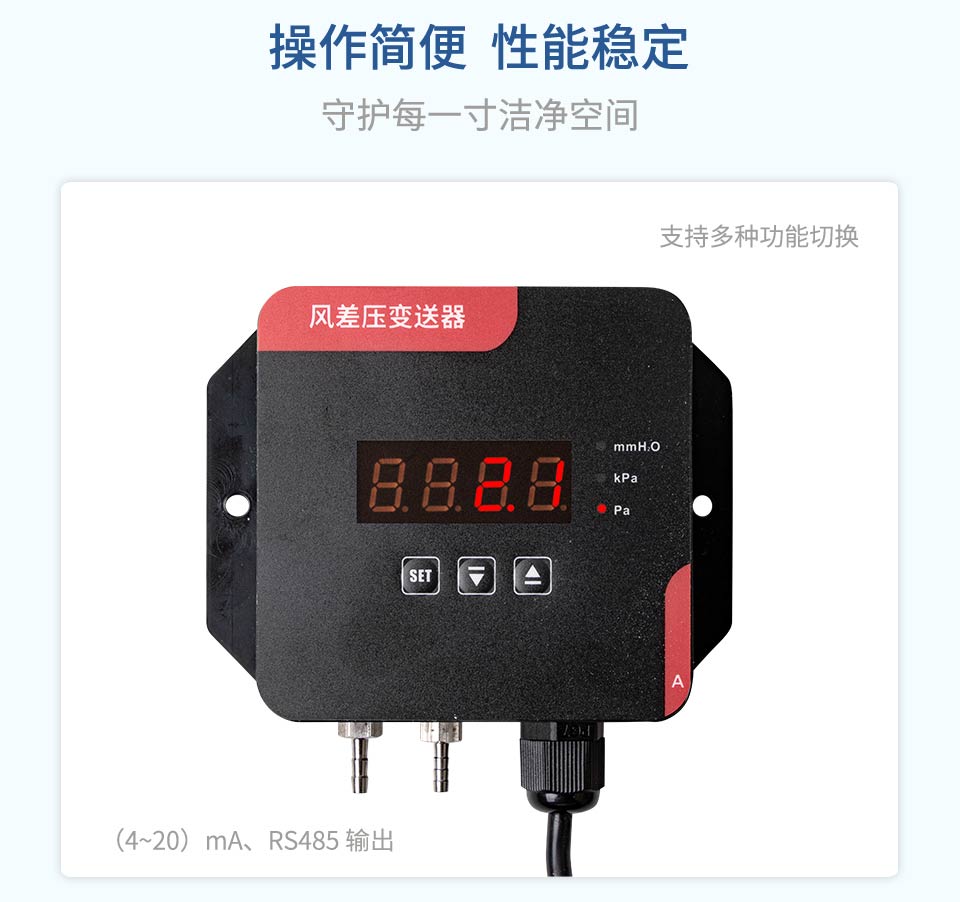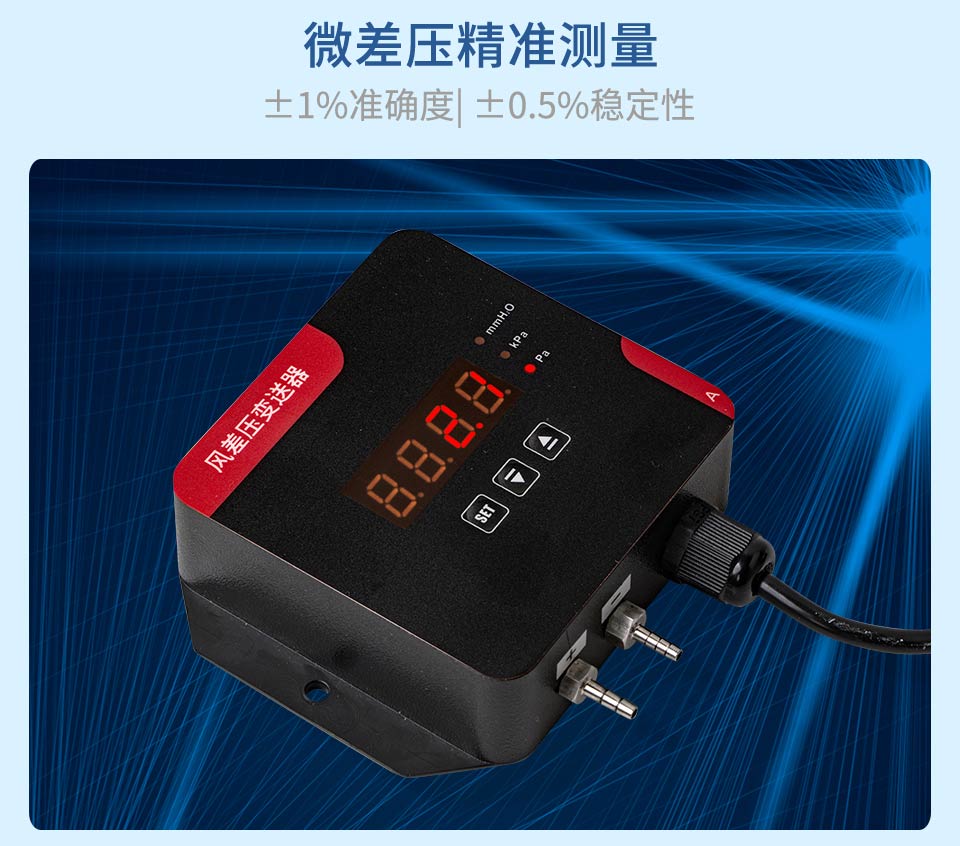 产品描述:数字风差压变送器采用原装进口差压传感器做为感压元件,配合超低功耗数字调理电路,使其具有精度高、长期稳定性好等特点。与机械差压计相同的安装方式,便于工程人员现场安装调试。该系列数字风差压表可用于洁净室、手术室、无尘室、通风系统、 风机测试等对于高精度微差压的测量与控制。