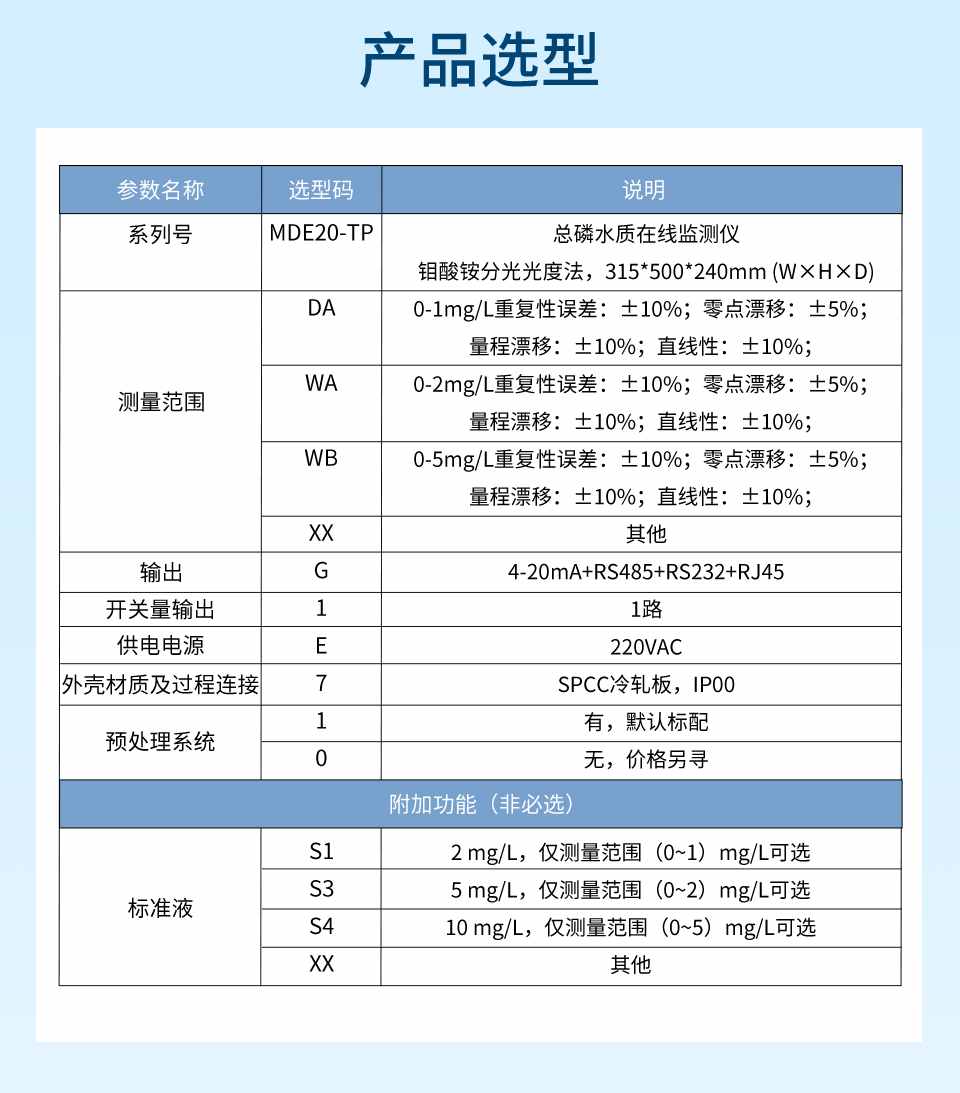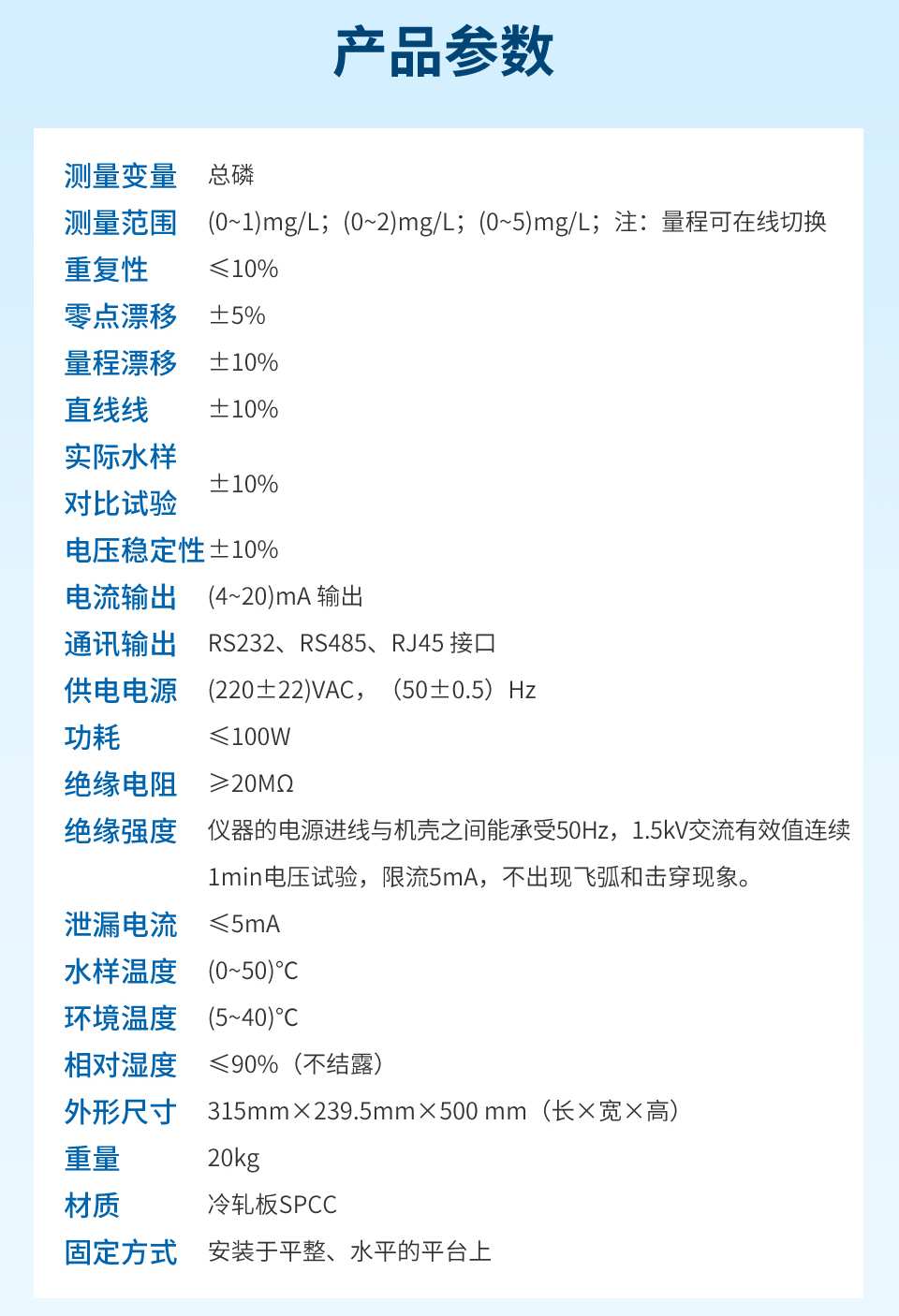 产品描述:TP 型总磷水质在线分析仪采用钼酸铵分光光度法检测,符合《总磷水质自动分析仪技术要求》(HJ/T 103)、《水质 总磷的测定 钼酸铵分光光度法》(GB 11893)、《污染物在线自动监控(监测)系统数据传输标准》(HJ 212)、《地表水自动监测仪器通信协议技术规定》等标准和规范的要求。