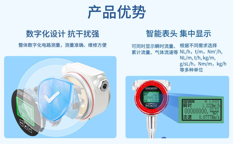 产品描述:热式气体质量流量计是基于热扩散原理而设计的,该仪表采用恒温 差法对气体进行准确测量。具有体积小、数字化程度高、安装方便,测量准确等优点。
