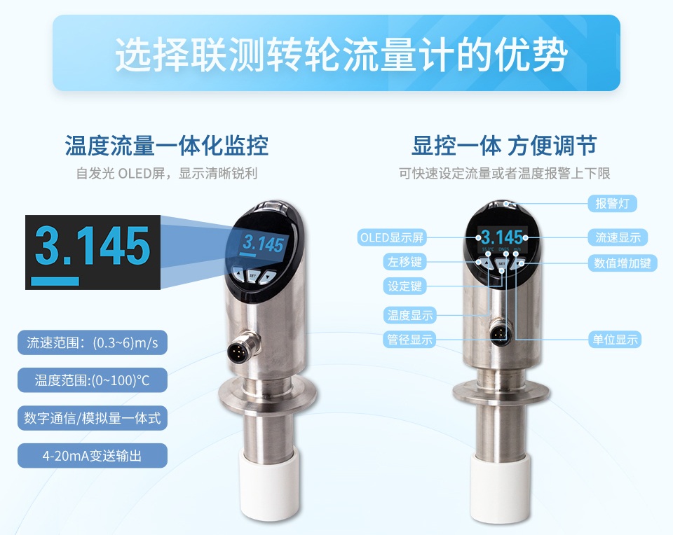 产品描述:转轮流量计结构简单、稳定性高、安装维修使用方便等特点,可对管道中的液体流动及温度情况进行实时监控,提供流量及温度的信号输出,流量及温度报警开关输出,并采用 OLED 显示屏实时显示流体流速及温度,实现管道当中温度流量一体式的监控。被广泛应用于半导体、光伏、石油化工、电力、治金、钢厂、造纸、食口品加工、水处理、电池厂等行业。