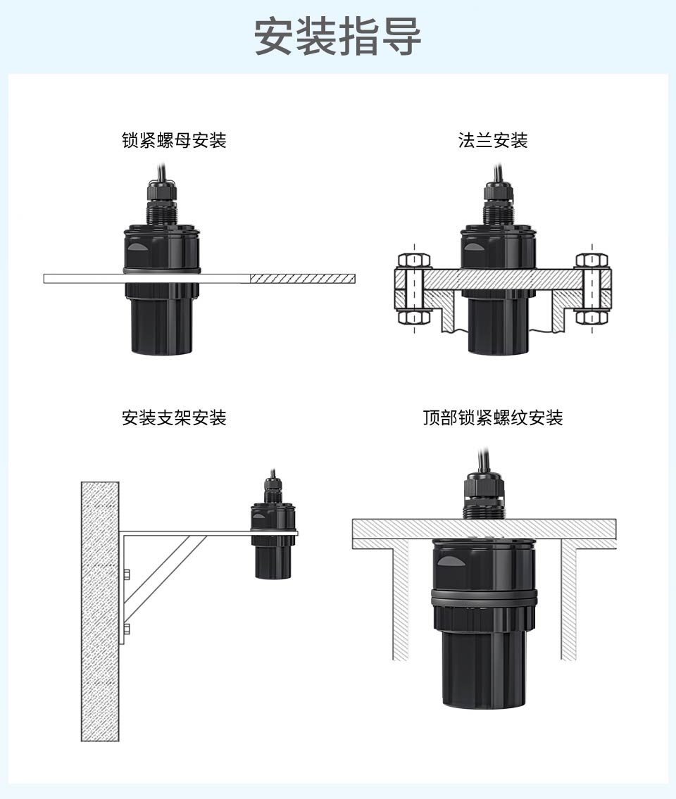 产品描述:本超声波液位计是我司研制的一款高集成度的液位/物位测量仪器。探头采用 PC/ABS 混合材质工程塑料外壳,壳体小巧且坚固。它具有高可靠、无污染、性能稳定、不接触工业介质就能满足大部分液位、料位测量要求,解决了压力式、电容式、浮子式等传统测量方式带来的缠绕、堵塞、泄露、介质腐蚀、维护不便等缺点。本产品标配蓝牙无线通讯功能,用户可在微信小程序查看数据和远程监控。常见的应用工况,如市政、化工、储运等工业环境中的河流、水池、储罐等液位测量。