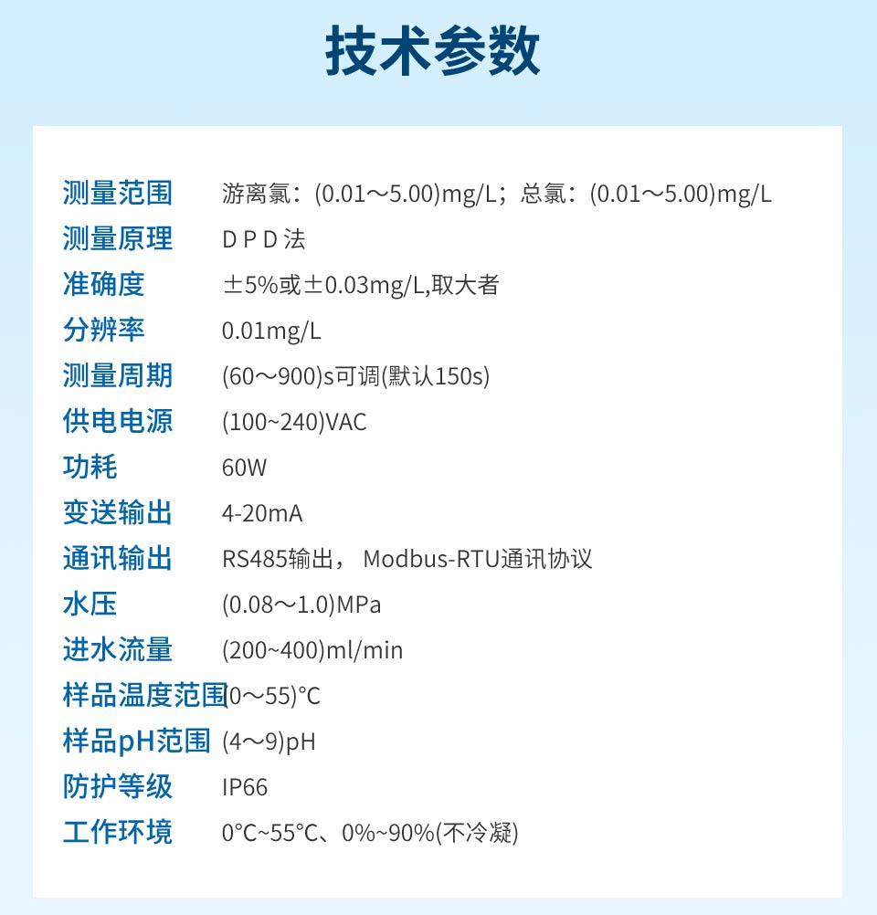 产品描述:余氯在线分析仪是一款对水中游离氯、总氯进行准确测定的一款仪器。广泛用于自来水厂、自来水管网、游泳池、冷却循环水、水质处理工程等水溶液中余氯含量的连续监测和控制。