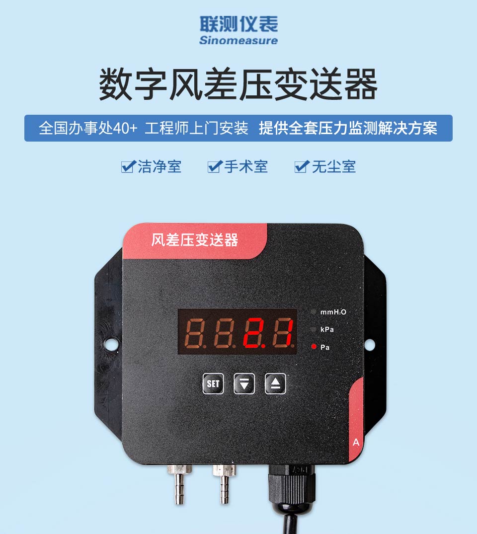 产品描述:数字风差压变送器采用原装进口差压传感器做为感压元件,配合超低功耗数字调理电路,使其具有精度高、长期稳定性好等特点。与机械差压计相同的安装方式,便于工程人员现场安装调试。该系列数字风差压表可用于洁净室、手术室、无尘室、通风系统、 风机测试等对于高精度微差压的测量与控制。