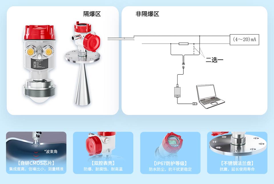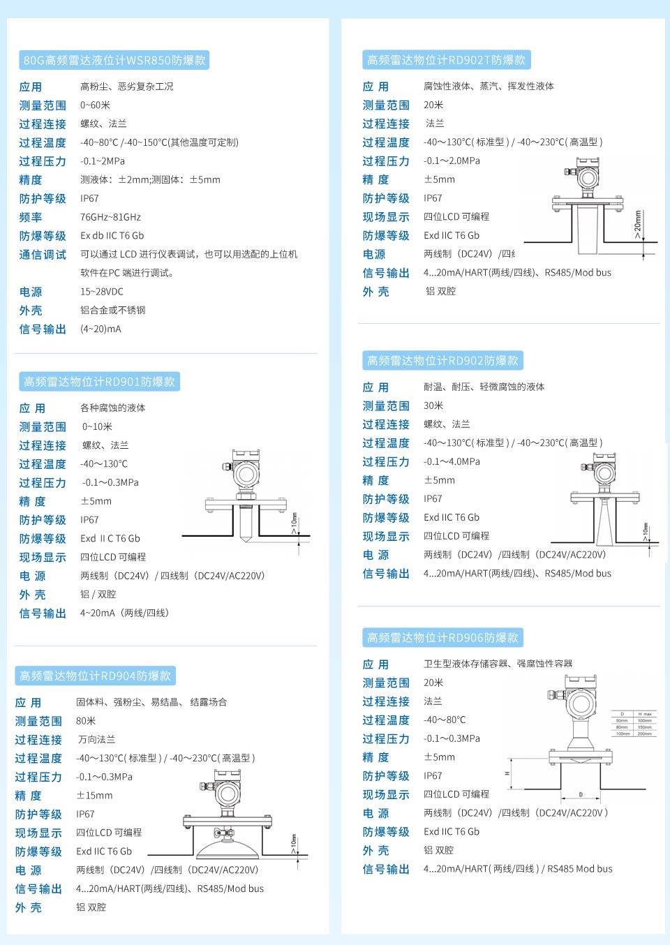 产品描述:80G高频防爆雷达液位计工作频率更高,波长更短,所以尤其适合固体应用,通过透镜发射接收电磁波的工作方式,在高粉尘,恶劣温度环境下具有独特的优势。仪表提供法兰或者螺纹的连接方式,使得安装便捷简易。