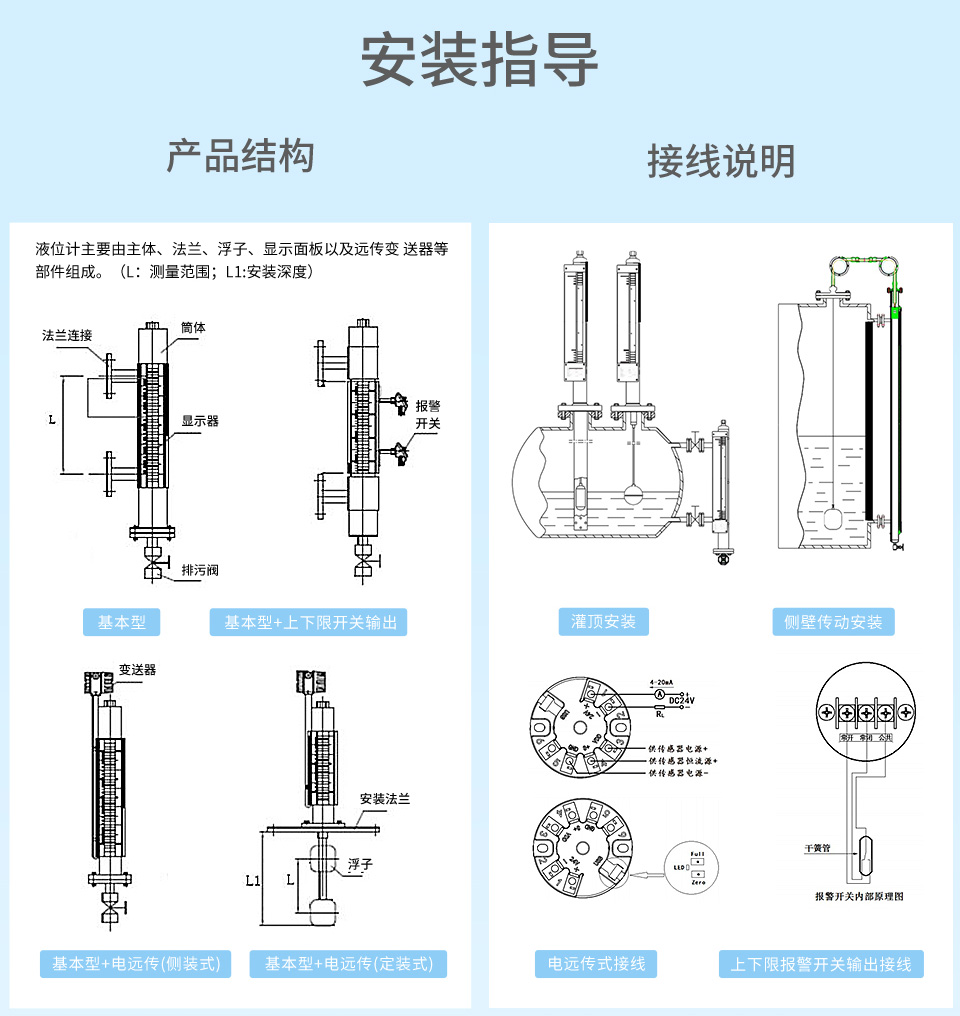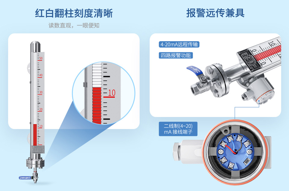 产品描述:磁翻板液位计用于测量有压容器或开口容器内液体的液位。本产品不仅可就地指示,配上液位控制开关、报警开关,可实现液位的控制、报警和连锁,配上内置式一体化液位变送器,可将液位(界面)信号转换成二线制(4~20)mA 标准信号,实现液位远距离检测和控制。可广泛应用于石油加工、市政、食品加工、化工、水处理、制药、电力、造纸、冶金、船舶和锅炉等领域。