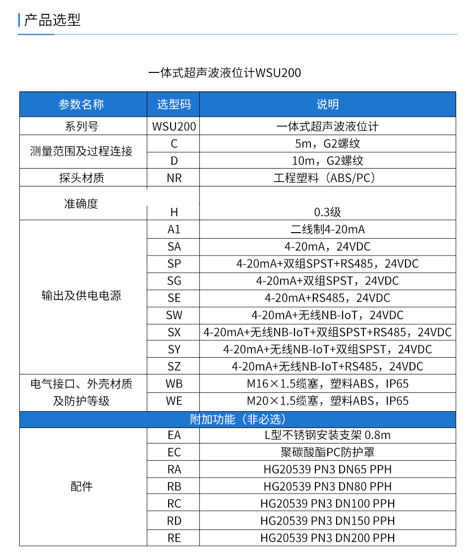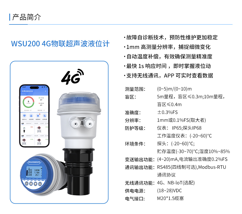 产品描述:WSU-200 4G物联超声波液位计具有高可靠性、高性价比、易安装维护的液位/物位测量仪器,可广泛用于各种液体和固体物料高度的测量。本产品可选配 NB-IoT 无线通讯功能,用户可在仪表云平台进行数据查看和远程监控。常见的应用工况,如市政、化工、储运等工业环境中的河流、水池、储罐等液位测量。咨询热线:400-185-1718