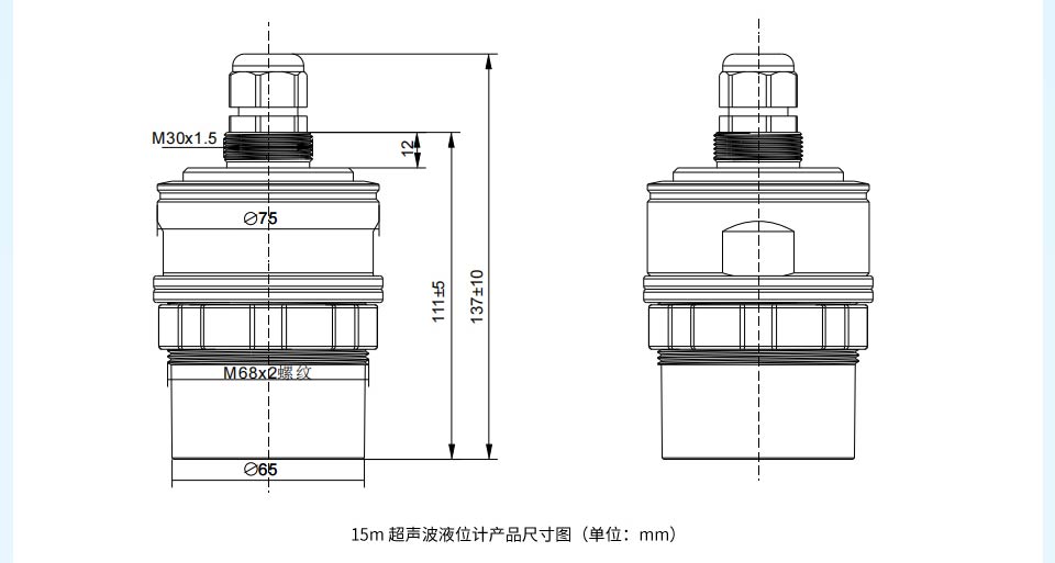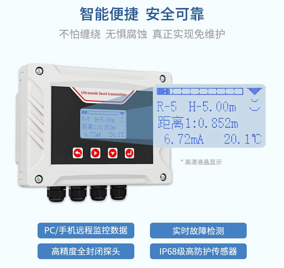 产品描述:本超声波液位计是我司研制的一款高集成度的液位/物位测量仪器。探头采用 PC/ABS 混合材质工程塑料外壳,壳体小巧且坚固。它具有高可靠、无污染、性能稳定、不接触工业介质就能满足大部分液位、料位测量要求,解决了压力式、电容式、浮子式等传统测量方式带来的缠绕、堵塞、泄露、介质腐蚀、维护不便等缺点。本产品标配蓝牙无线通讯功能,用户可在微信小程序查看数据和远程监控。常见的应用工况,如市政、化工、储运等工业环境中的河流、水池、储罐等液位测量。